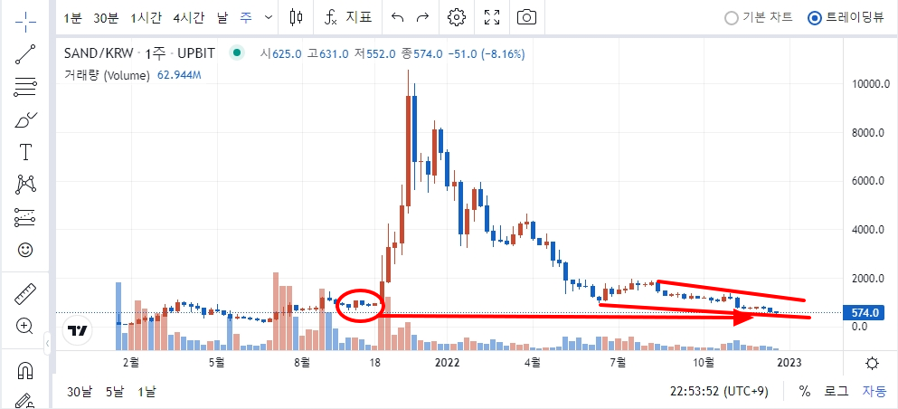 샌드박스 주봉 기준으로 살펴보면 현재 시세는 574원으로 이전 지지선 부근까지 내려온 상태입니다. 단기적으로는 더 하락할 수 있는 자리가 보여서 약세장이 지속될수록 조금씩 빠지는 모습을 보여 줄 것 같습니다. 이제는 하락의 속도가 이전만큼은 아니지만 현재 샌드박스의 관심이 많이 떨어진 상태로, 타 코인들보다 거래량이 거의 나와주지 않는 모습을 봤을 때 약간의 하락이 더 있거나, 오랜 횡보로 이어질 가능성이 있습니다.