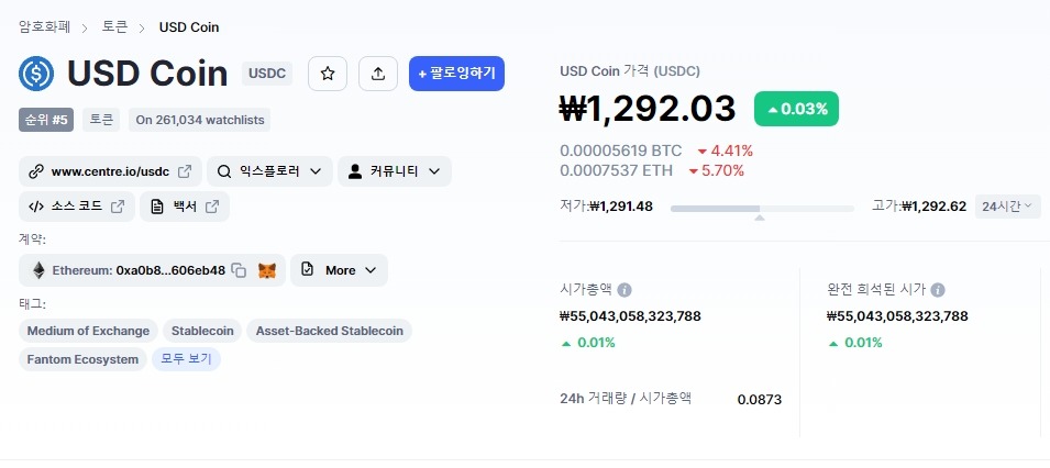 위에서 보시듯 현재 1달러는 1,292.63원 입니다. 그렇다면 같은 시간대에 다른 스테이블 코인들도 원화 환산 가치가 1달러와 비슷해야겠죠?